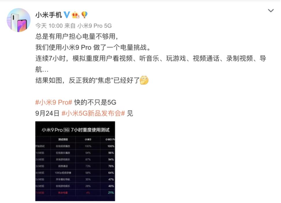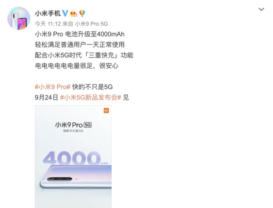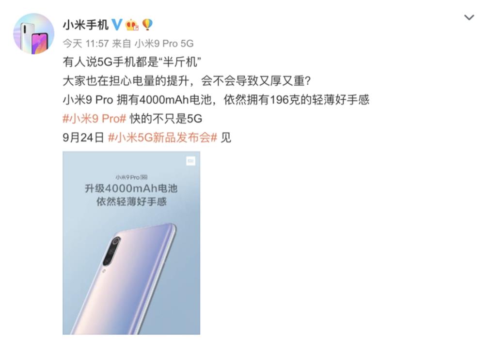 5G手机带来的不仅仅是速度的提升,他也给手机厂商们带来了一堆麻烦,手机电量消耗快,就是其中最大的麻烦!目前市场上的5G手机都搭载的是大电池!所以手机重量都比4G手机要更重!但小米9Pro选择了4000mA的大电池,重量也才196g,向半斤机的标签说不!除了为5G的功耗准备了大电池外,小米9Pro还准备了三重快充技术!
