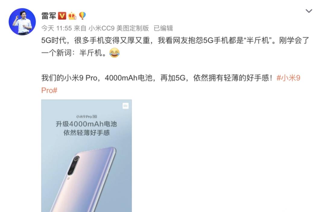 前几天千元机市场各大手机厂商斗得不可开交,这几天5G手机的市场各家厂商也纷纷出招,斗得不可开交。但随着5G手机不断的推出,有细心的网友发现,最新推出的5G手机重量基本都在半斤左右,所以网友们又戏称5G机为半斤机!但不是所有的5G手机都是半斤机!小米9Pro,就很轻薄!