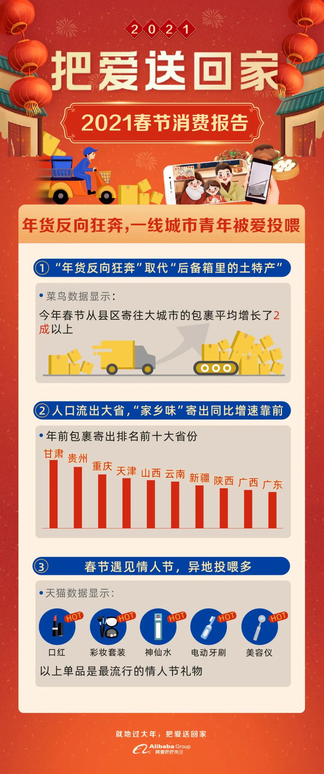 这注定是个异常温暖的年。阿里巴巴2月16日发布的《把爱送回家》春节消费报告显示,快递成为人们遥寄“思念和乡愁”的桥梁,家乡年货反向狂奔与淘宝式拜年相映成趣。